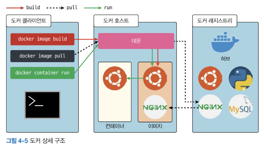 - docker client에 명령어 입력 -> docker host의 docker daemon이 명령을 수신 -> docker host에 image가 존재하지 않는다면 docker registry에서 다운로드