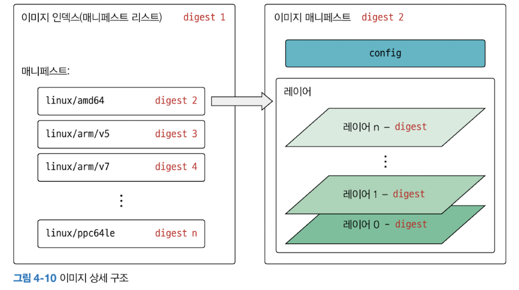 - 각 image manifest는 다양한 OS 및 Architecture에서 해당 image를 활용할 수 있도록 설정값(config)과 다양한 Layer 제공