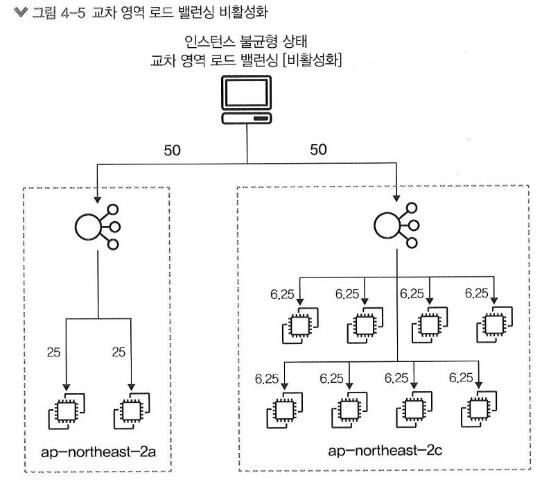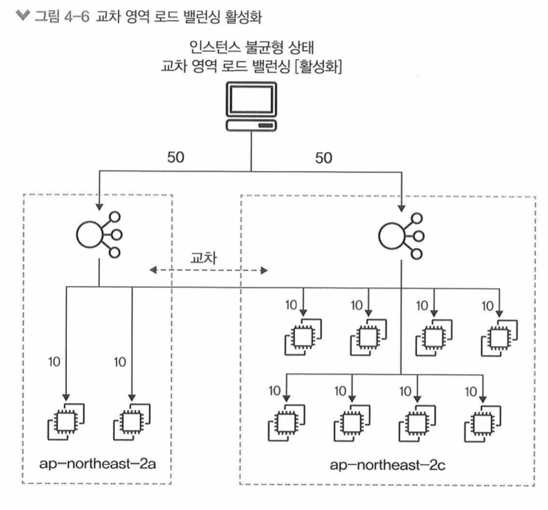 - 이때 target group에 등록된 대상이 여러 가용 영역에 걸쳐 있다면 -> load balancer는 동일한 비중으로 가용 영역 내에 있는 대상으로 트래픽을 분산 -> 가용성 향상, but 가용 영역 내 instance 수량이 불균형할 때는 일부 인스턴스로 트래픽이 몰리고 다른 instance는 유휴 상태가 되는 불균형 처리 문제 발생