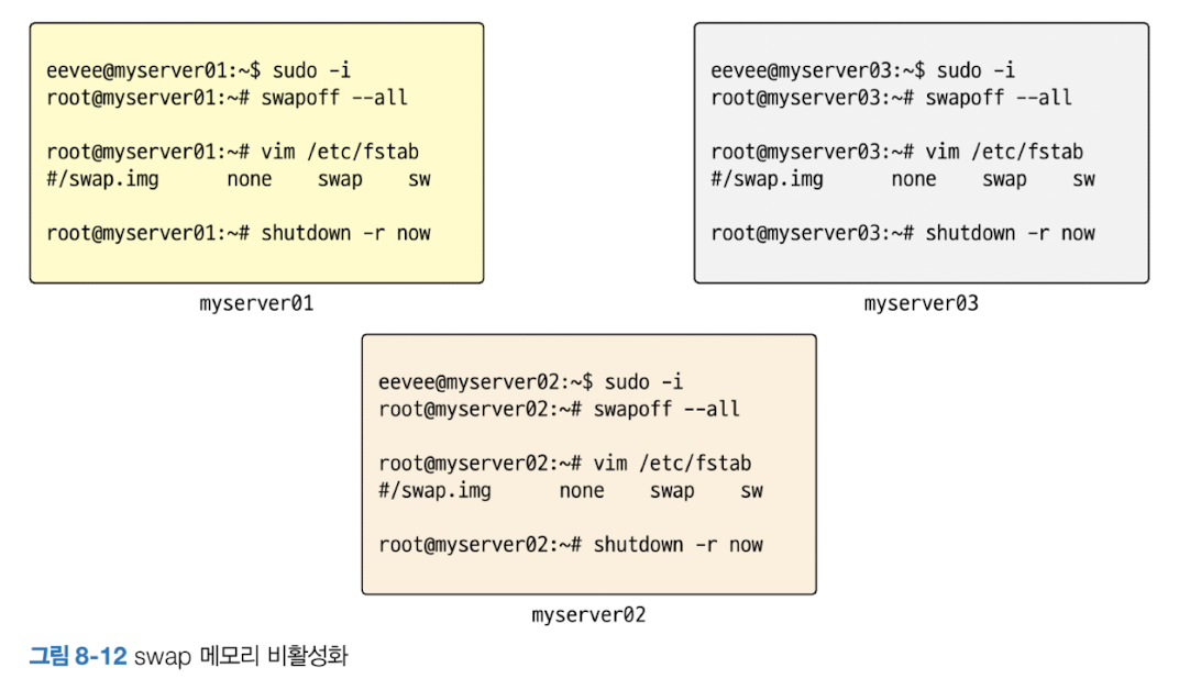 - 쿠버네티스는 수많은 컨테이너를 동시 관리 -> 원할하게 컨테이너를 관리하려면 swap 메모리 영역을 비활성화 해야 함