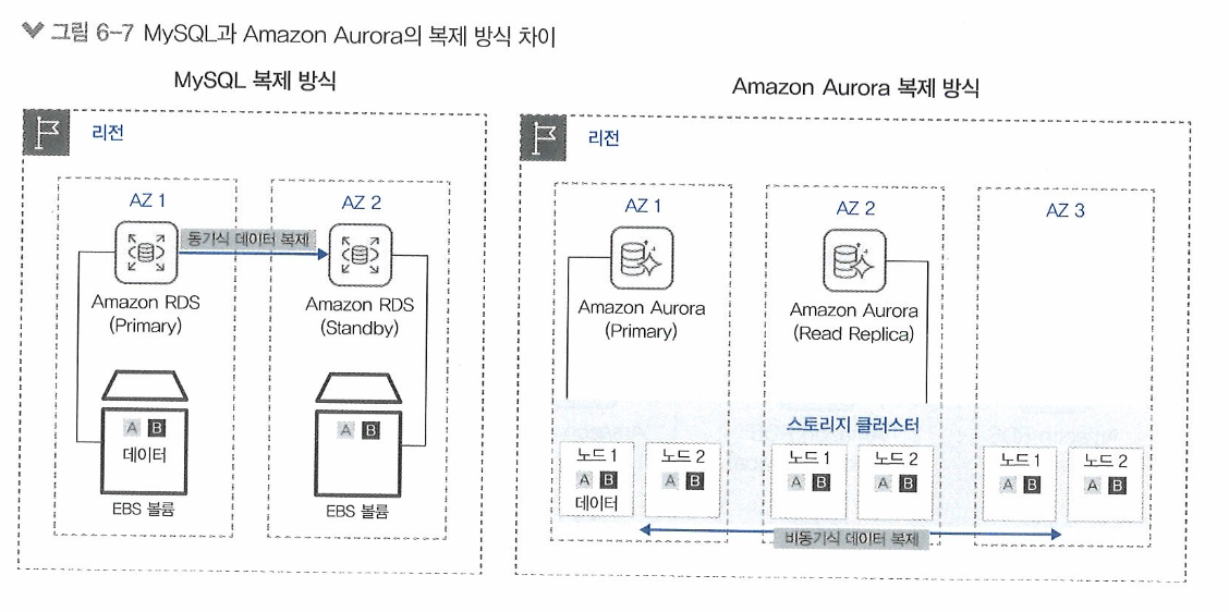 - Amazon Aurora: 공유 스토리지를 통해 최소 3개의 가용 영역에서 두 개씩 총 여섯 개의 복제 데이터를 가지고 있어 더욱 안정적으로 서비스