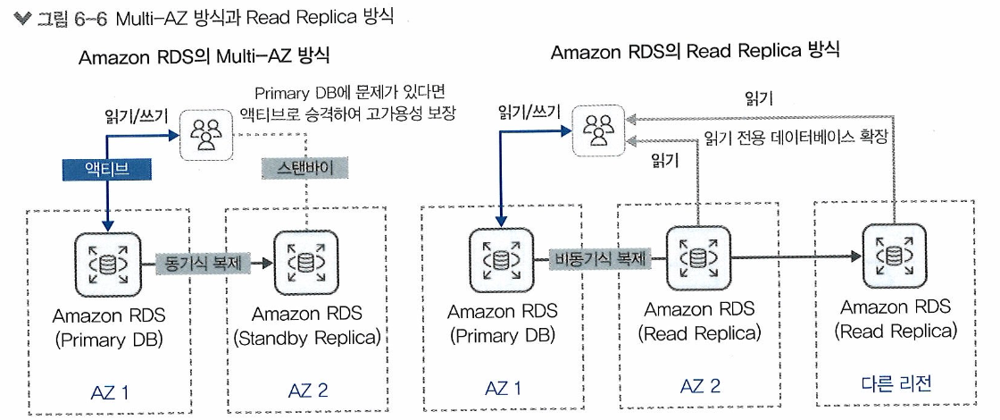 - Amazon RDS는 최소 다섯 개의 Read Replica DB를 복제 가능 -> 다른 Region까지 Read Replica DB를 가질 수 있음
