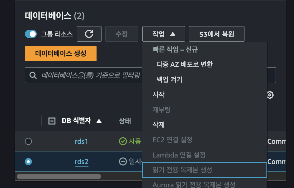 -> Read Replica 설정 조건 중에 자동 백업 기능이 활성화 상태여야 한다는 조건이 있음 -> RDS2는 백업 보존 기간이 '0일'(자동 백업을 비활성화 한다는 의미) -> Read Replica 설정 불가능