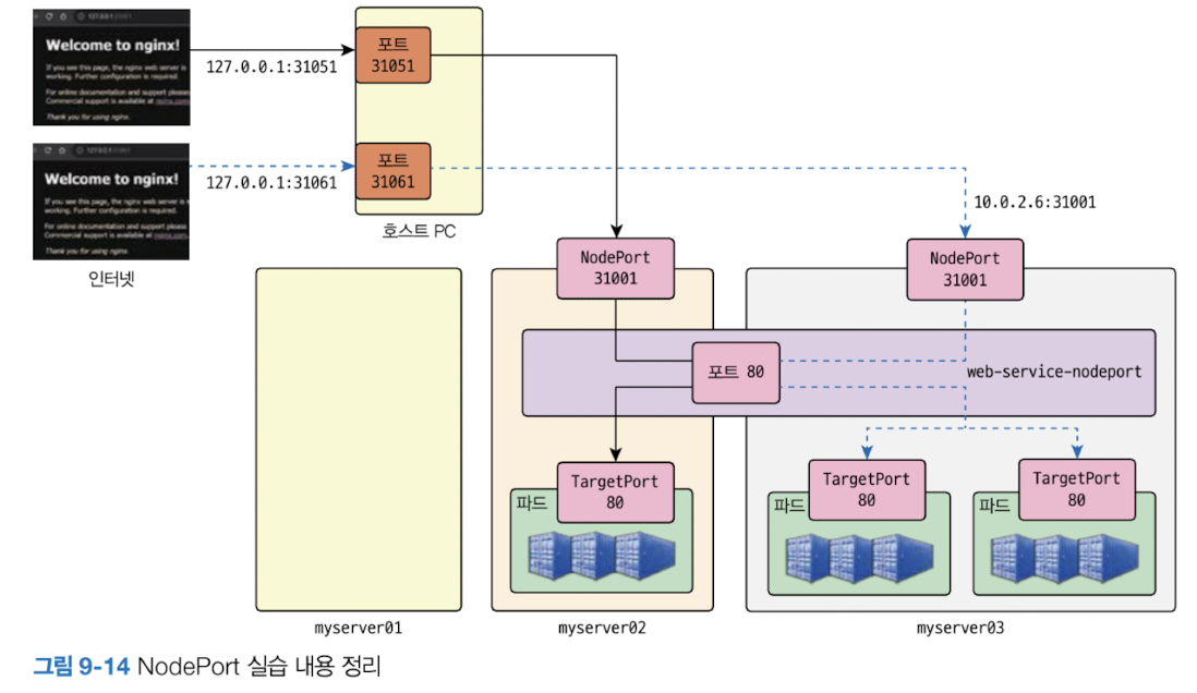 -> client에서 포트 31051로 접근하면 myserver02가 위치하는 노드의 NodePort 31001에 접근