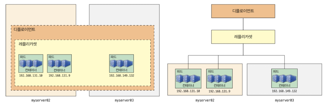 - Replicaset: 원하는 파드 개수만큼 유지시켜주는 역할을 하는 컨트롤러