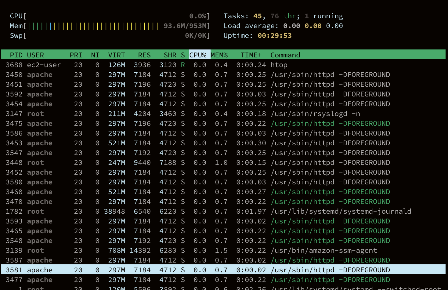 -> WebServers SSH 터미널에서 htop 명령어로 서버 자원의 CPU나 메모리 사용률 출력