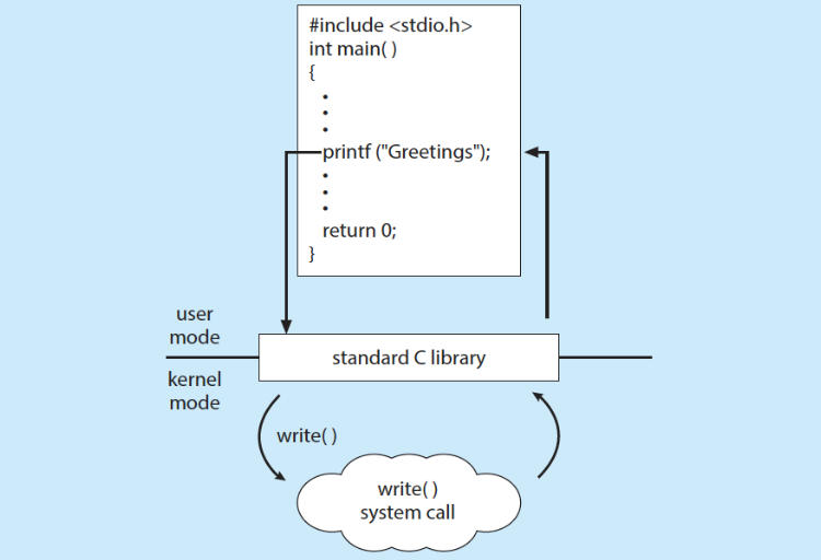 - kernel mode의 write() system call에, C program의 printf() function을 호출함으로써 접근