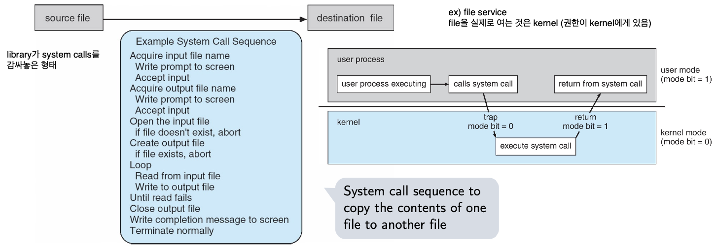 - program에서는 OS가 제공하는 service를 system call을 이용하여 사용 가능