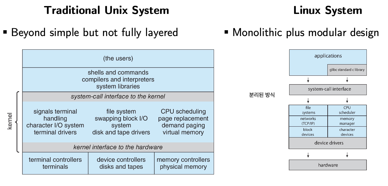 - Monolithic Structure: kernel의 모든 기능을 single address space에 위치한 single, static binary file에 위치