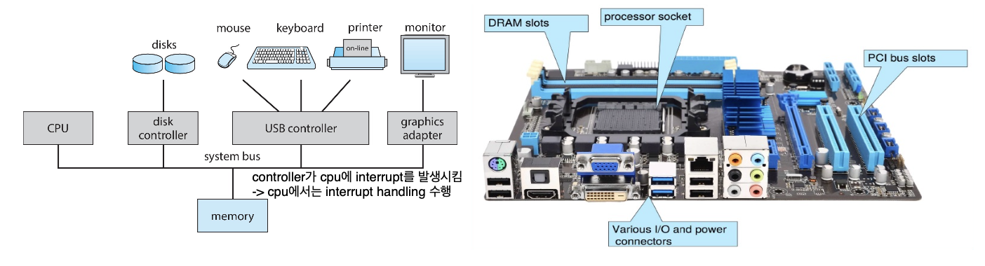 - 이런 device controller들은 common bus에 의해 연결되고, common bus를 통해 shared memory에 접근 가능 -> common bus를 통해 신호를 주고받음