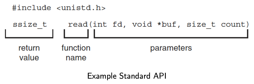 - C나 C++같은 고급 언어로 작성된 programs -> 직접 system call 호출 불가능 -> high-level API(Application Programming Interface)를 통해 syscall에 접근