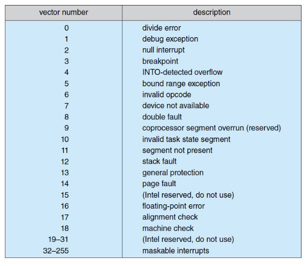 - Interrupt Vector: interrupting device에 알맞은 interrupt service routine의 주소를 가진 공간