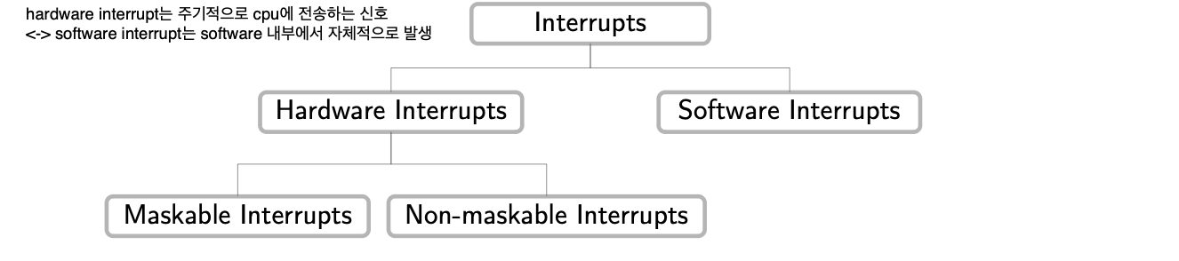 - Software Interrupts(exceptions): software events에 대한 response -> CPU의 software 내부에서 발생하는 interrupts