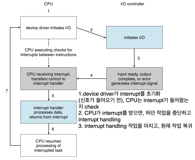- device controller는 operation이 끝나면 CPU에 interrupt 신호를 전송