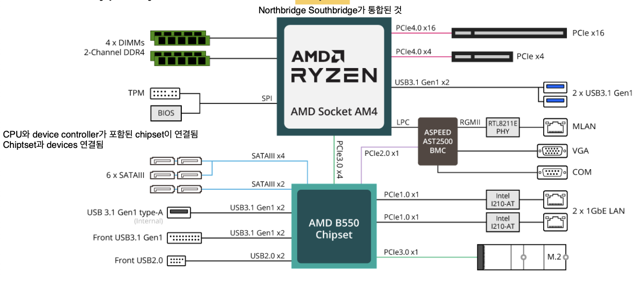 - CPU와 device controller가 포함된 chipset이 연결됨