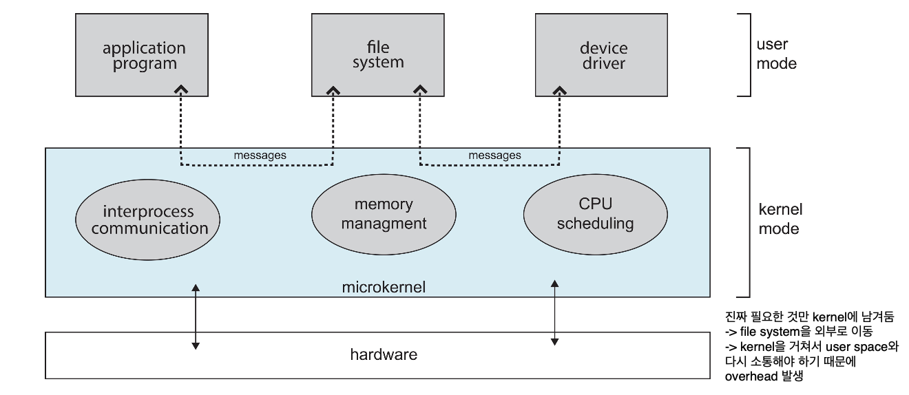 - kernel에서 가능한 한 많은 부분을 user space로 이동