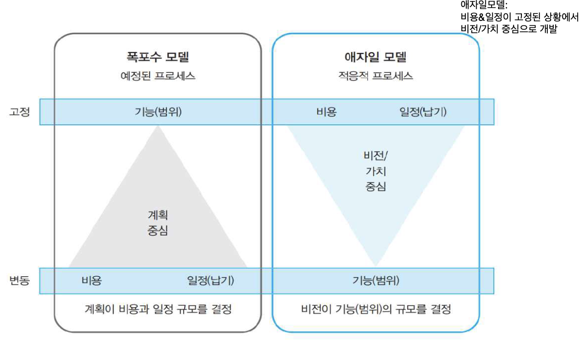 | 폭포수 모델 | 애자일 모델 |