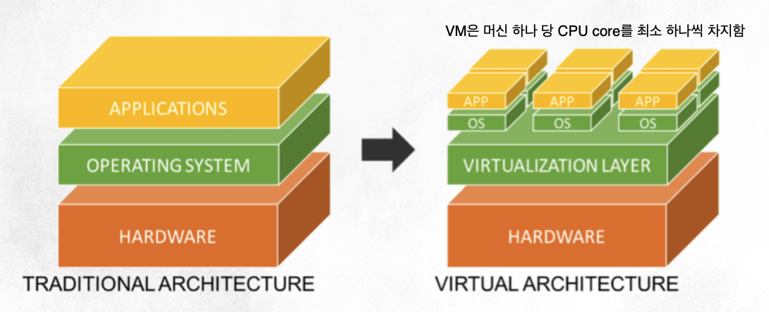 - 하나의 host computer가 multiple guest VMs를 실행할 수 있게 해줌 -> memory & processing 같은 자원을 가상으로 공유