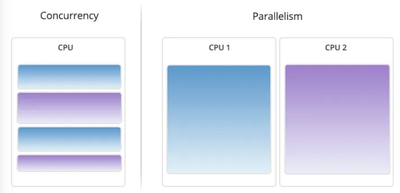 Parallelism: 실제로 같은 시간에 여러 작업을 동시에 처리 -> 속도를 높이는 목적