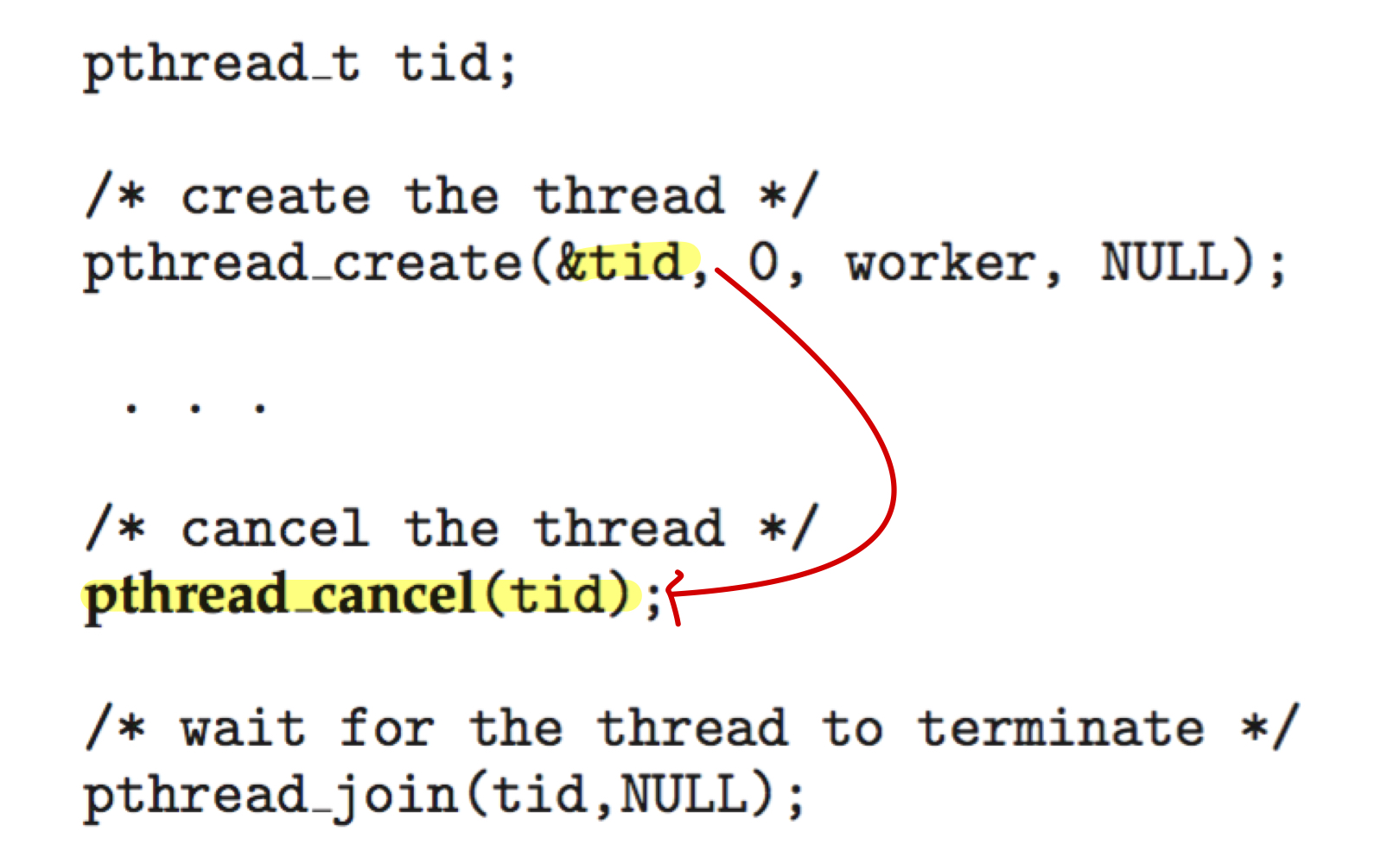 - thread cancellation 호출은 cancellation을 요청 -> but, thread의 실질적인 cancellation은 thread state에 달려 있음