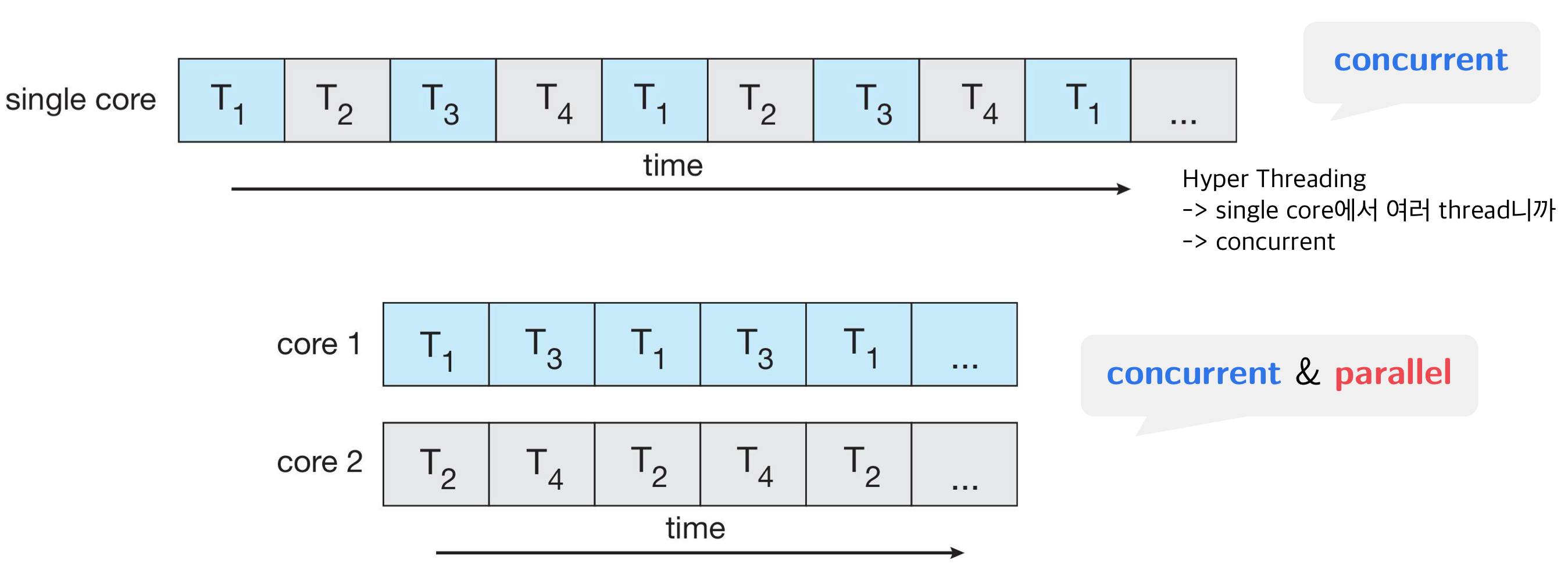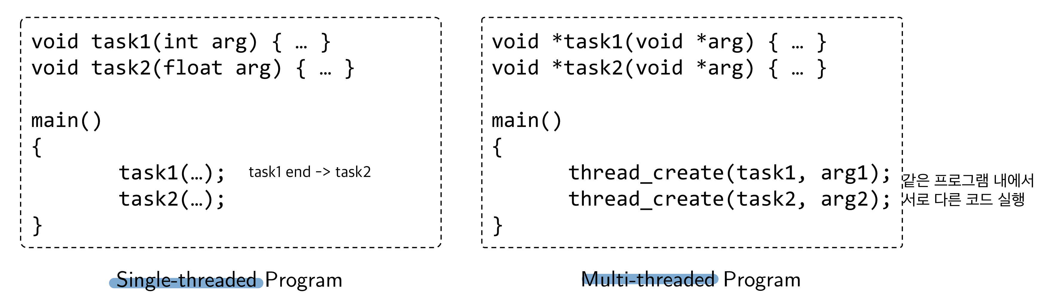 -> Multi-threaded Program에서 task1와 task2는 simultaneous하게 동작