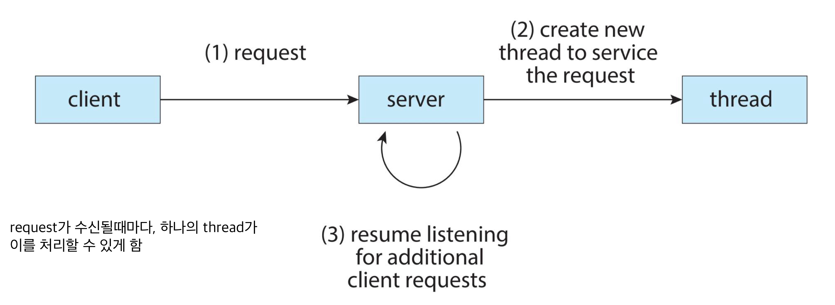 - request를 받아서, 해당 request를 처리하기 위한 새로운 threaed를 생성하고, server는 계속해서 requests를 받는 형태