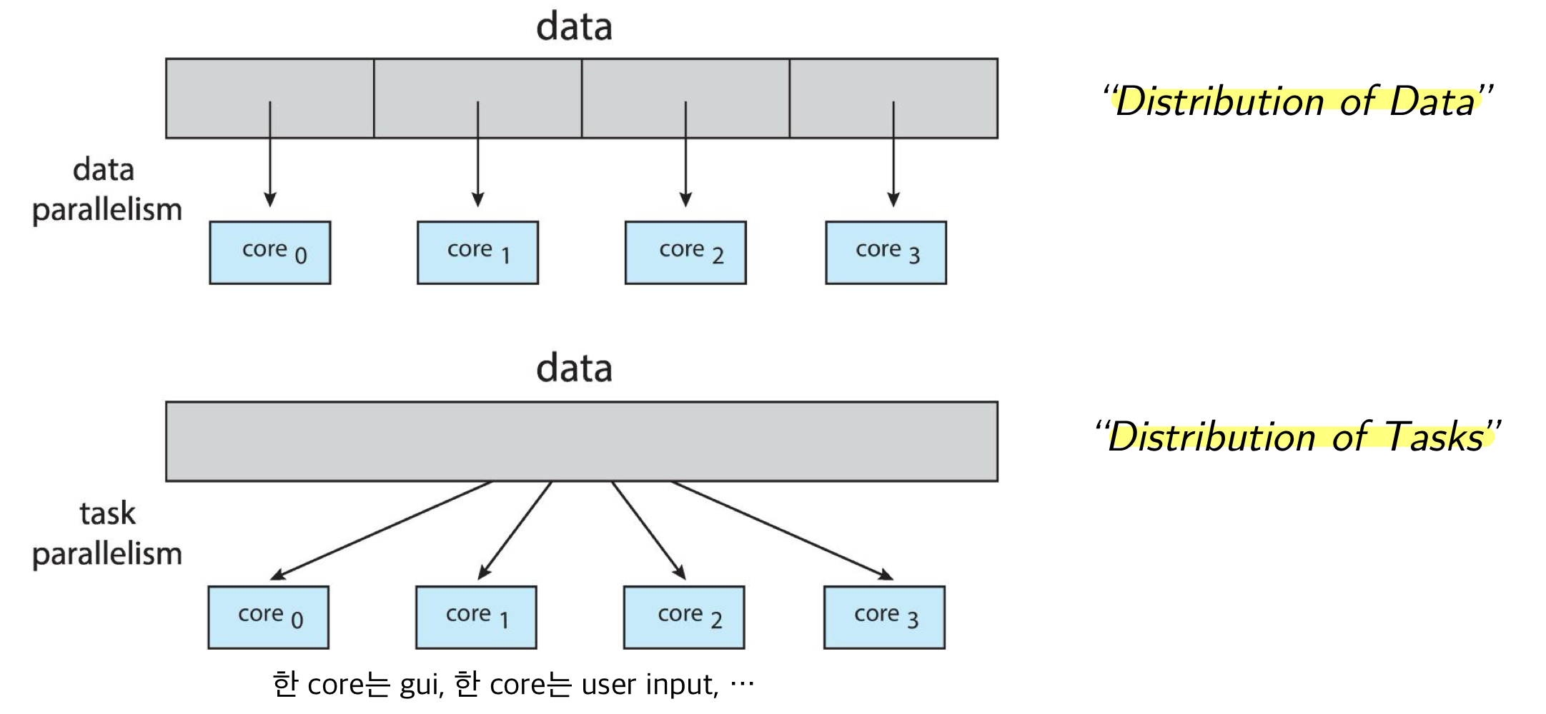 - Data parallelism: 같은 operation, but 다른 data subsets(core 간에) -> Distribution of Data