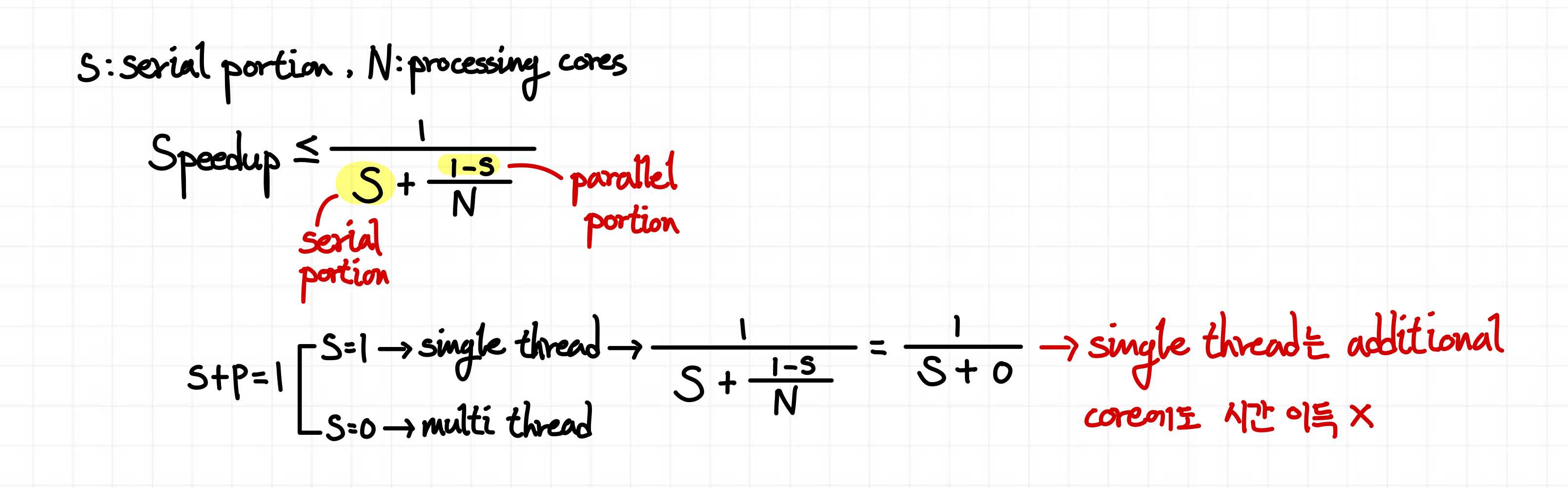 - N이 무한으로 갈 때, -> speedup은 1/S에 근접한다.