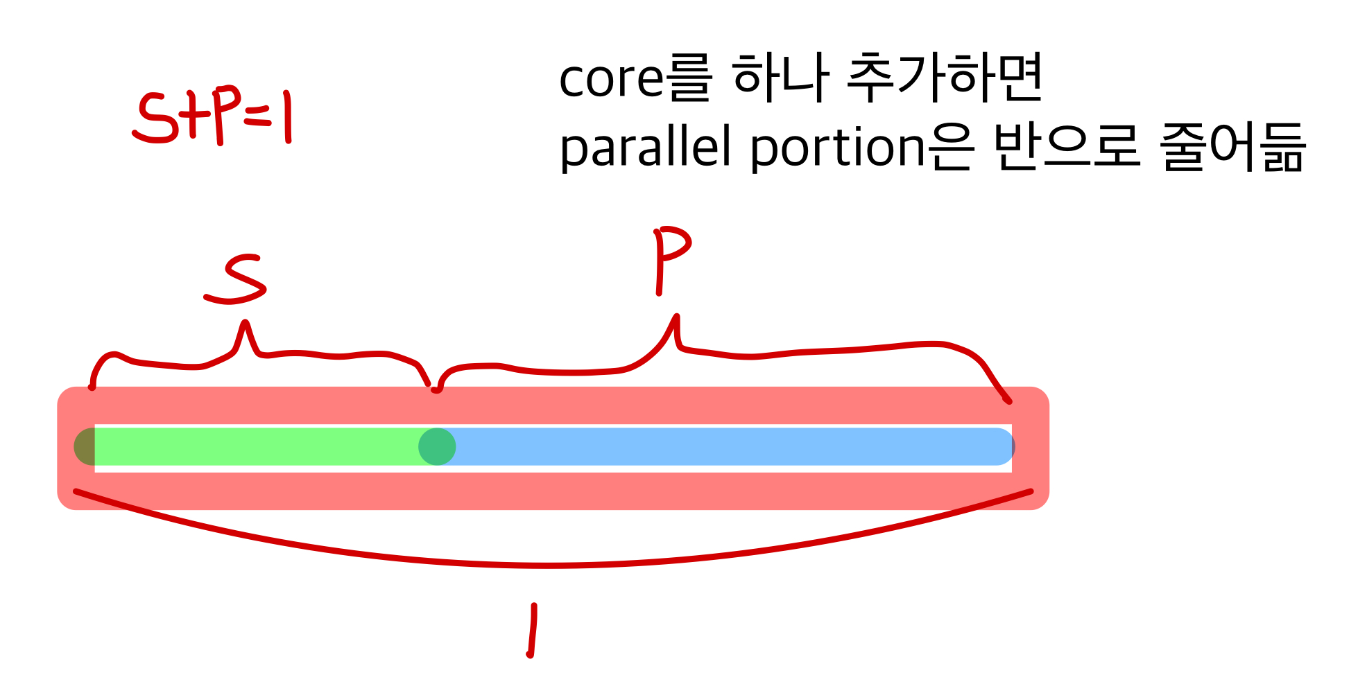 -> Parallel portion 항이 존재할 때, core의 수 N이 커지면 Speedup이 커짐