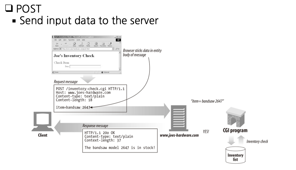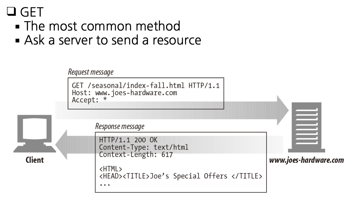 - GET: server에서 client에게 resource(HTML/CSS/JS, 이미지, 동영상 등)를 전송