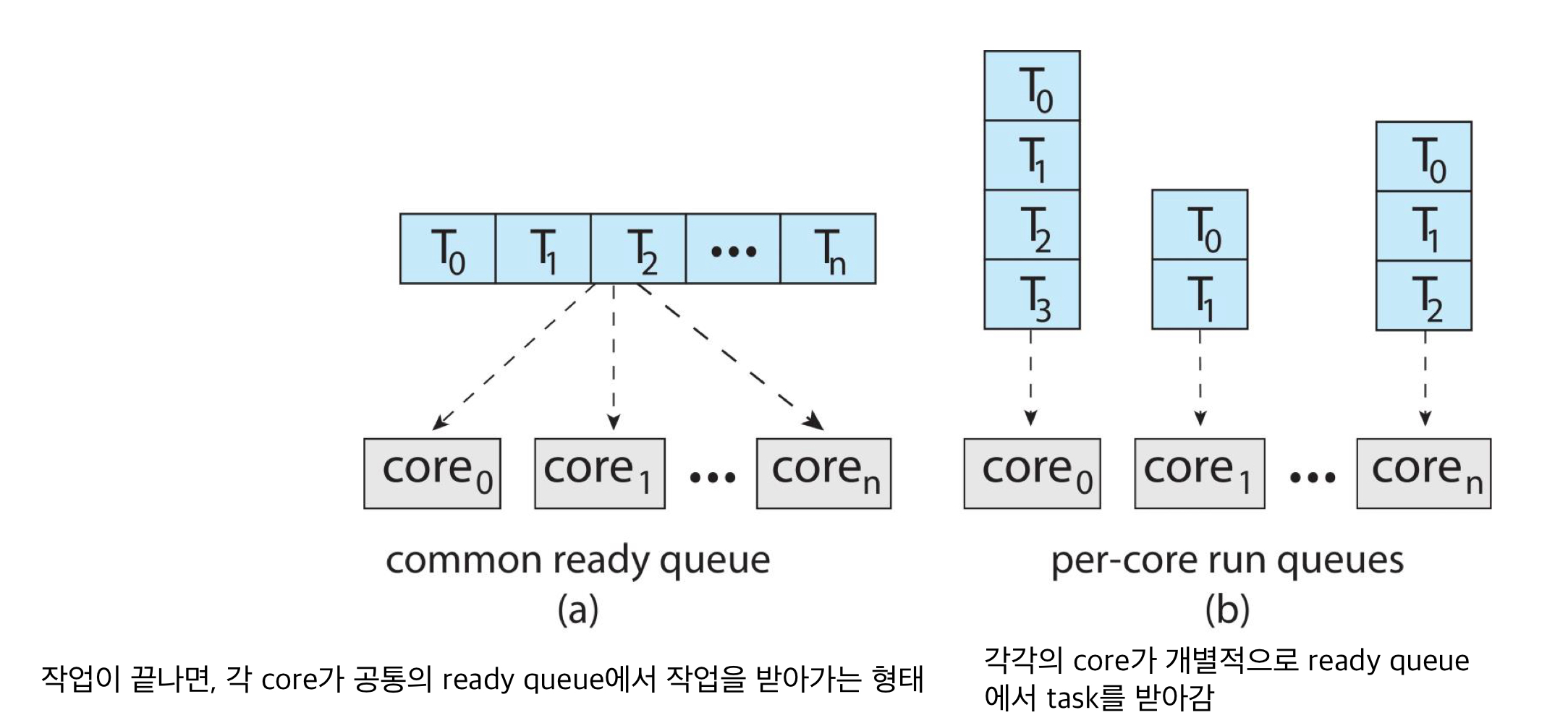 a) 모든 threads가 공통의 common ready queue 내부에 존재