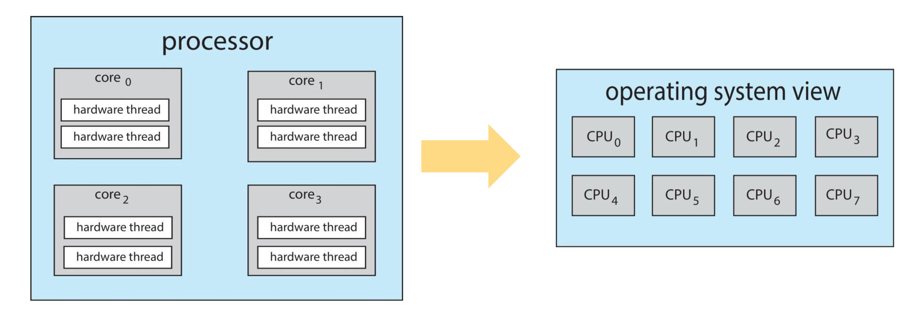 Hardware Threads - hardware-supported multi-threading / Hyper-threading에서 언급되는 개념 - single CPU core 위에서 multiple threads가 simutaneous하게 execution하도록 함 - 각 core는 multiple hardware threads를 관리