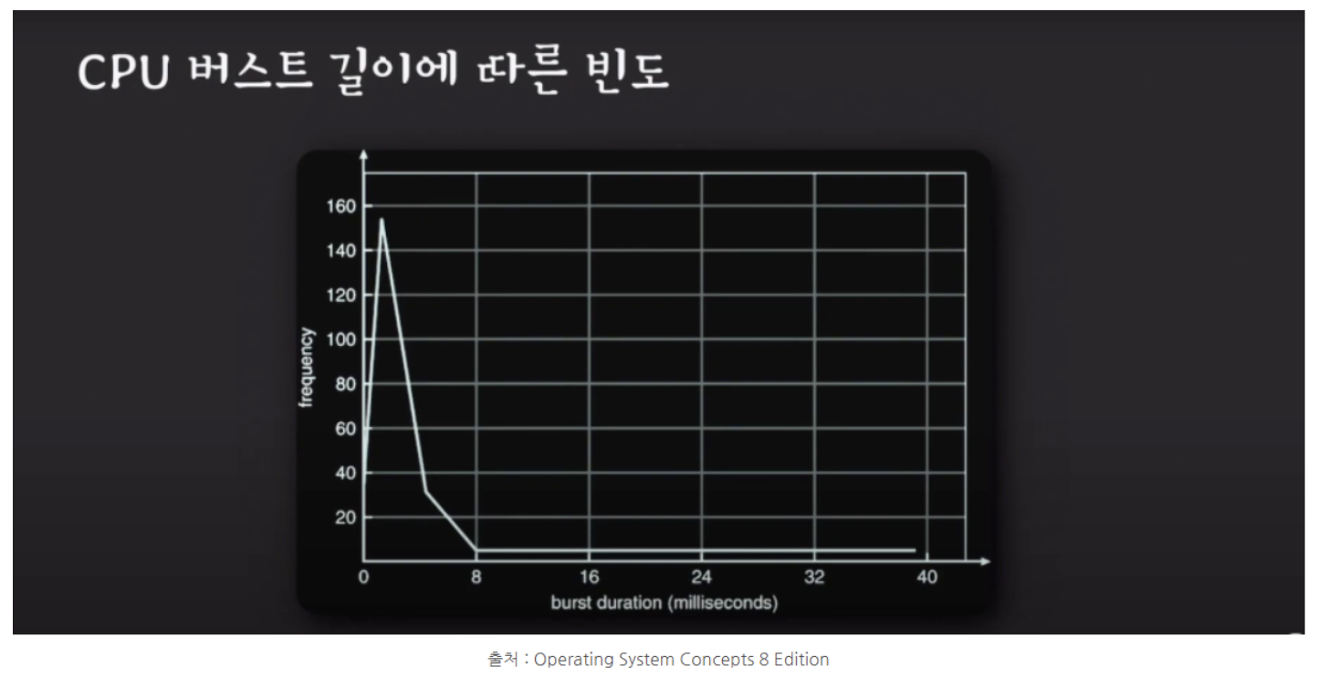 IO burst: 프로세스가 IO 작업을 요청 -> 그 결과를 기다리는 시간