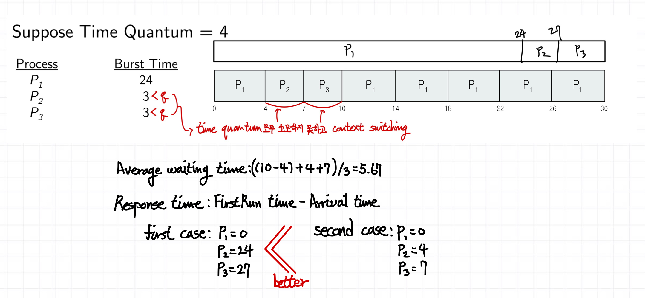 Response Time: process가 처음 실행되는 시간에서 프로세스가 도착한 시간을 뺀 시간