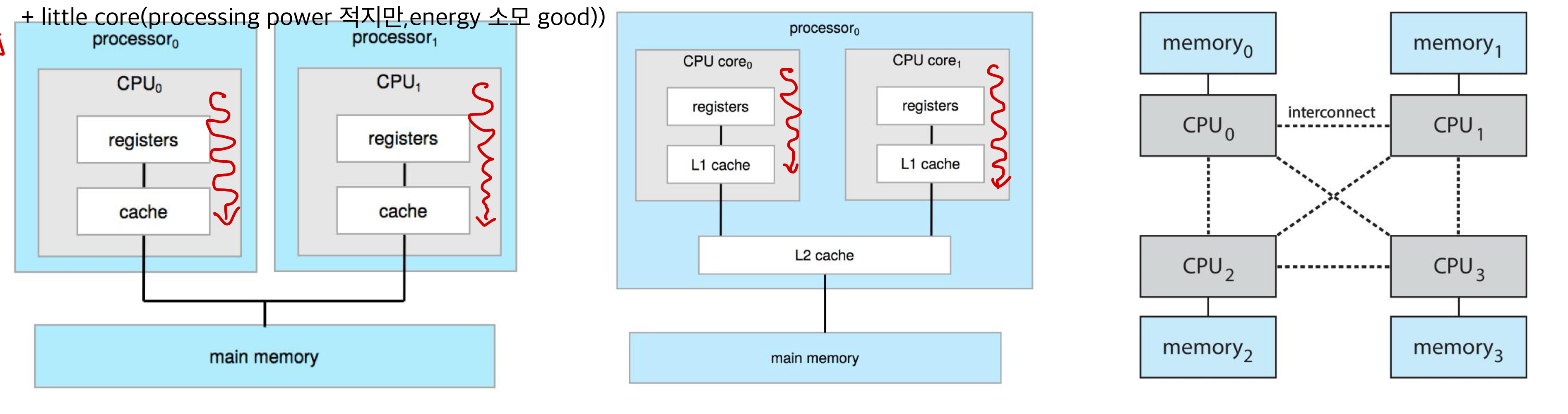 좌측부터 순서대로 Multiple CPUs, Multithreaded cores, NUMA(Non-Uniform Memory Access) systems