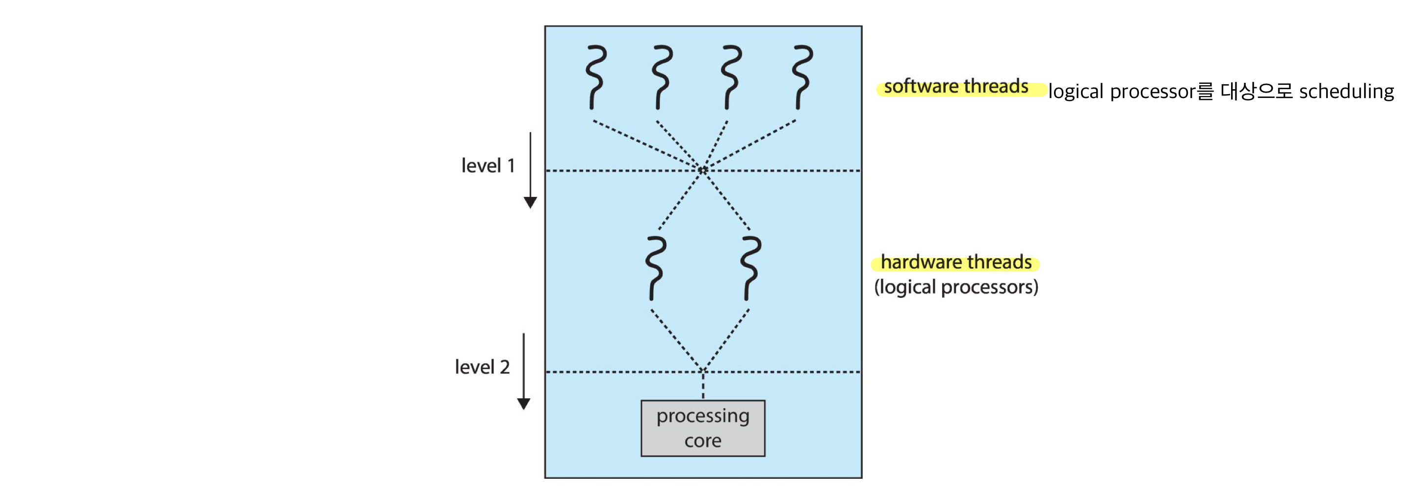 operating system은 logical CPU 위에서 어떤 software thread가 작동할지 결정