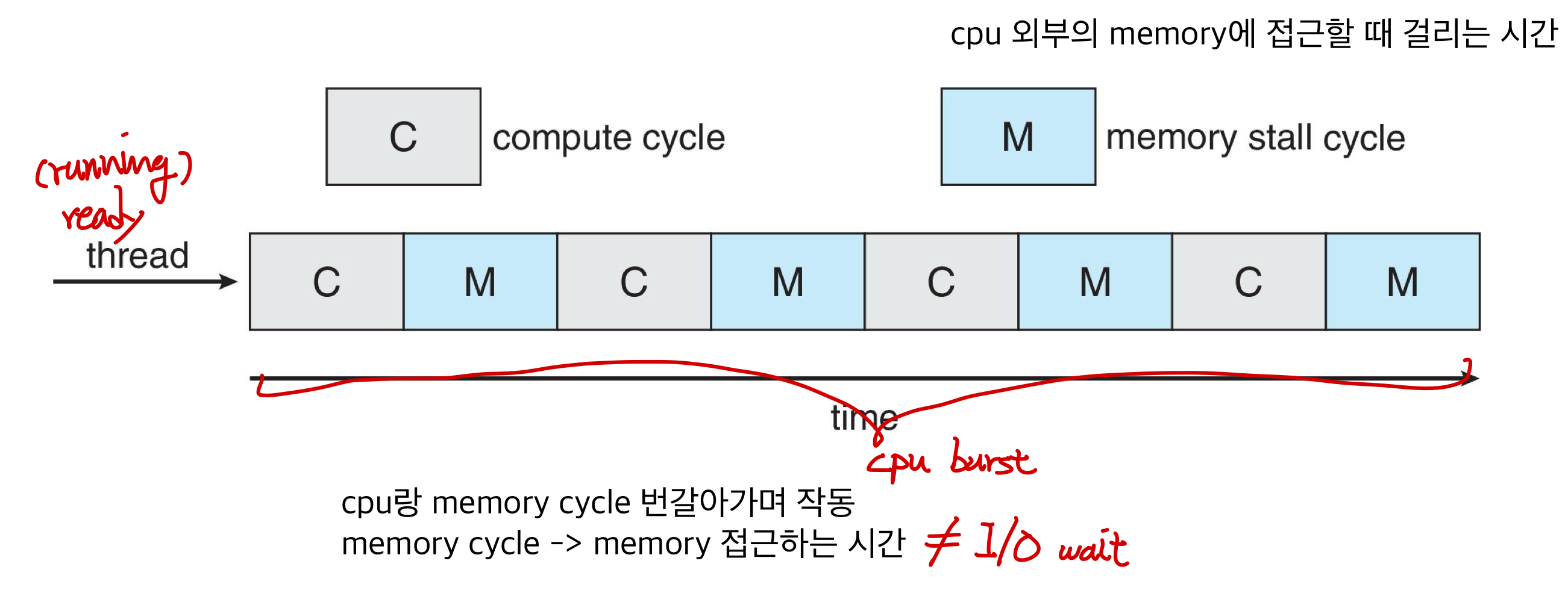 CPU burst: 프로세스가 CPU에서 한 번에 연속적으로 실행되는 시간을 의미 -> 메모리에 올라간 프로세스가 자신의 차례가 되어, CPU에서 실행될 때, 자신의 instructions가 CPU에서 연속적으로 실행되는 시간