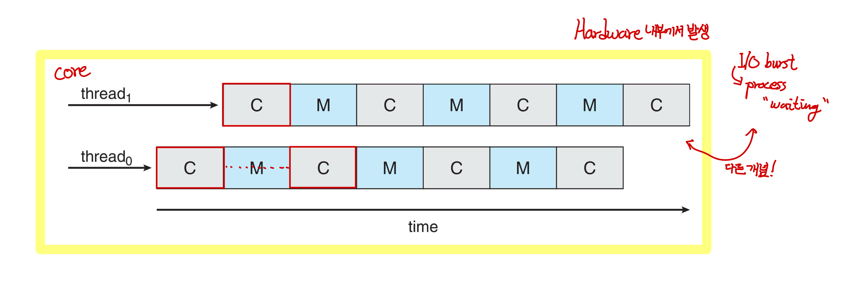 Multiple (hardware) threads per core -> memory stall의 이점을 이용 -> memory stall 대기시간 동안 또다른 thread 진행