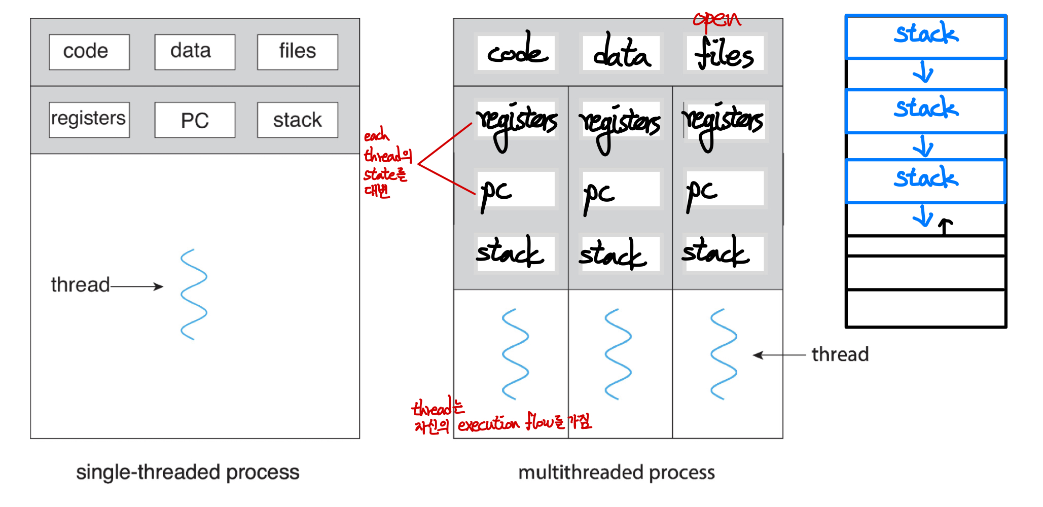 - 각 thread마다 memory 공간에서 stack을 가짐