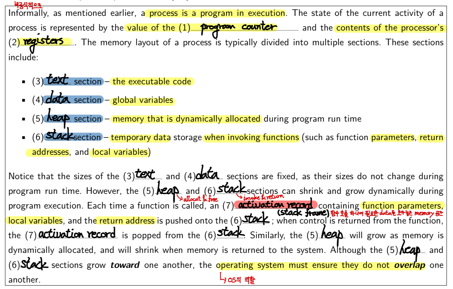 - heap & stack -> grow toward one another -> os가 둘이 overlap되지 않도록 보장해야함