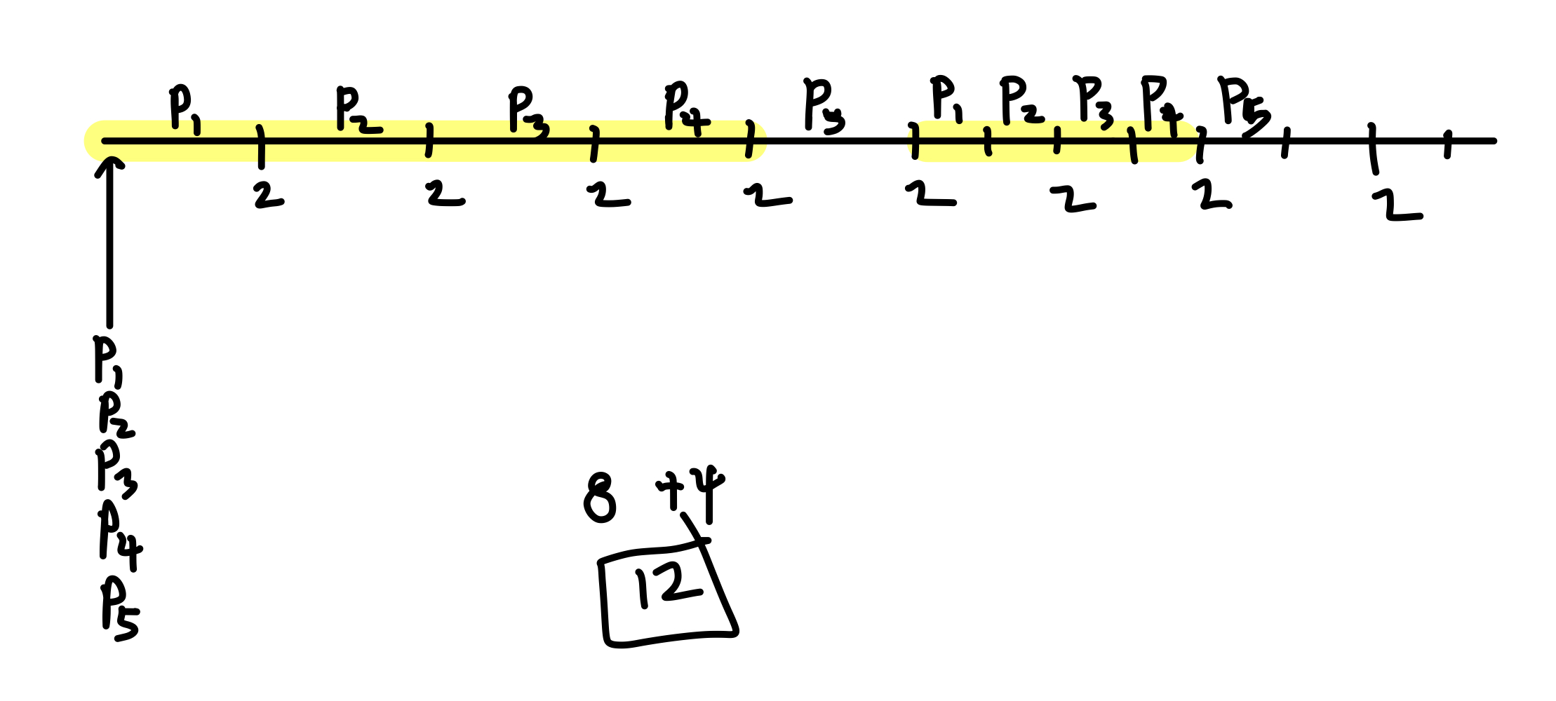 (2) 5 processes가 한 번에 도착, bust time은 3, time quantum 2의 round-robin scheduling을 적용했을 때, maximum waiting time?