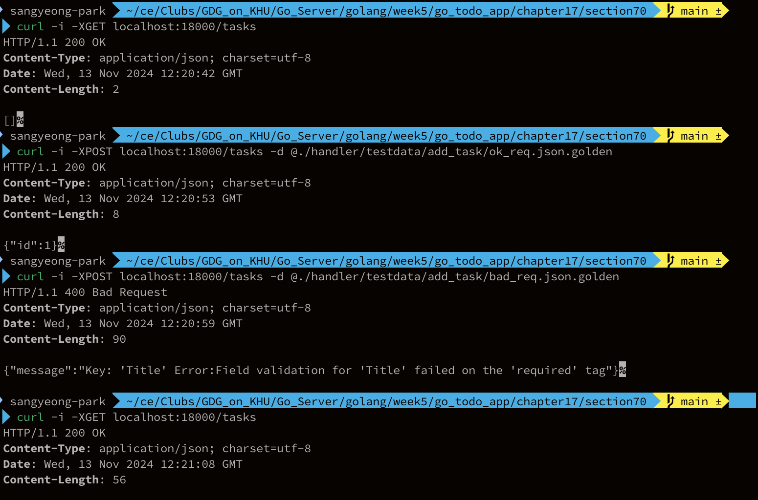 - 위 코드에서는 task title이 필수적 -> Title string 'json: "title" validate: "required"'라고 설정