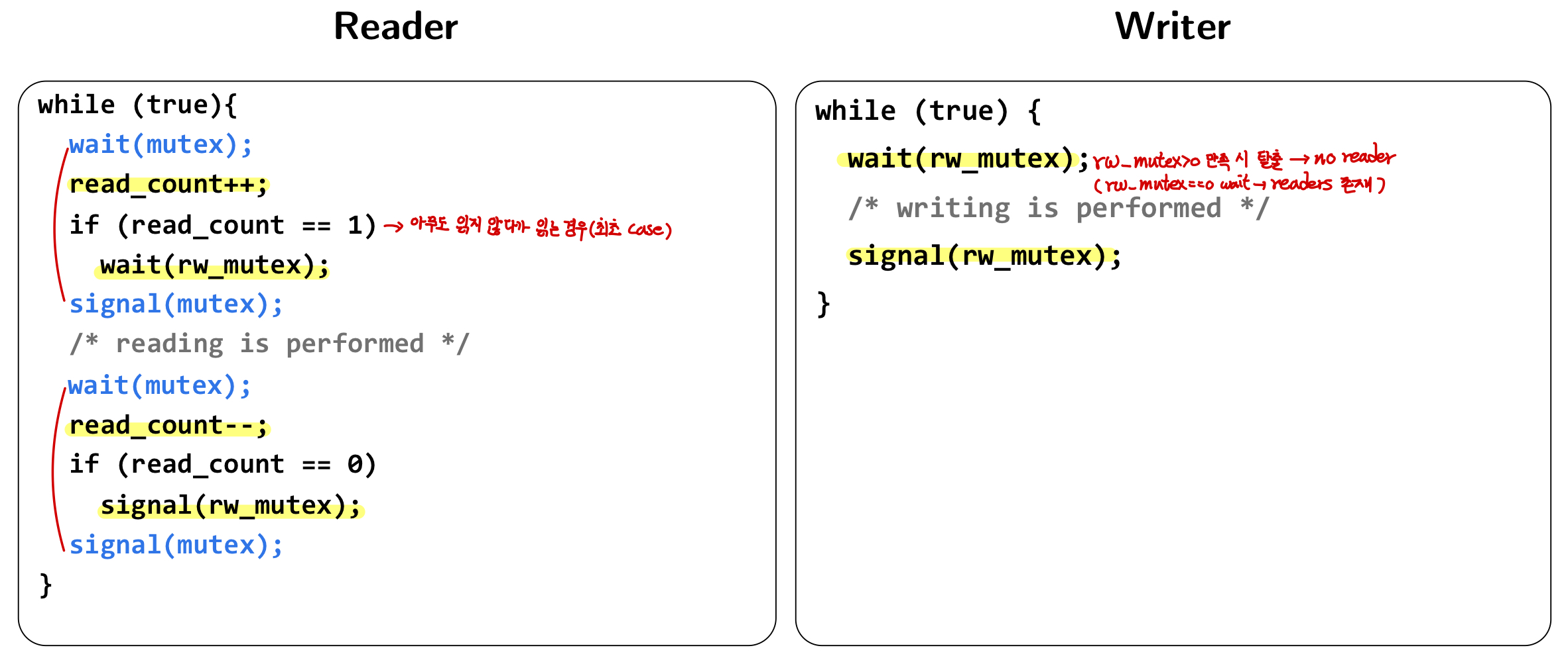 - mutex: read_count 보호 -> mutual exclusion