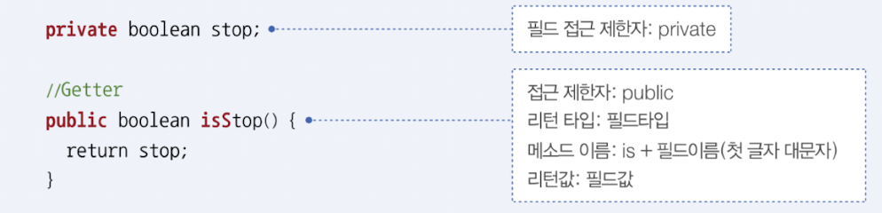 - boolean의 getter는 isName 형식 사용