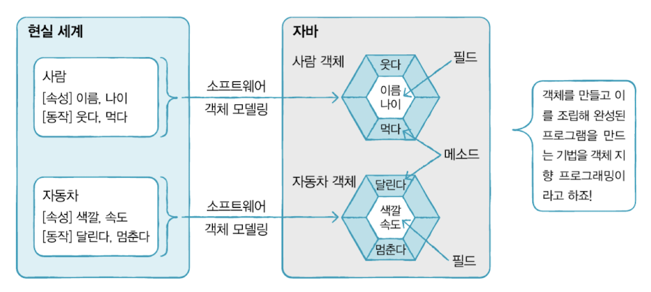 - 자바에서의 객체 = field(속성) + method(동작)