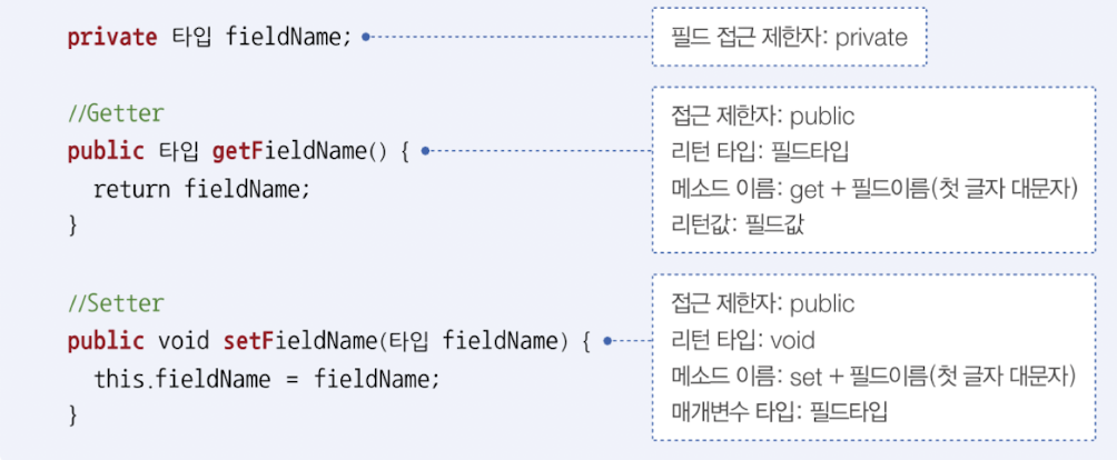 - Getter: 필드값을 적절히 가공하여 외부에서 사용
