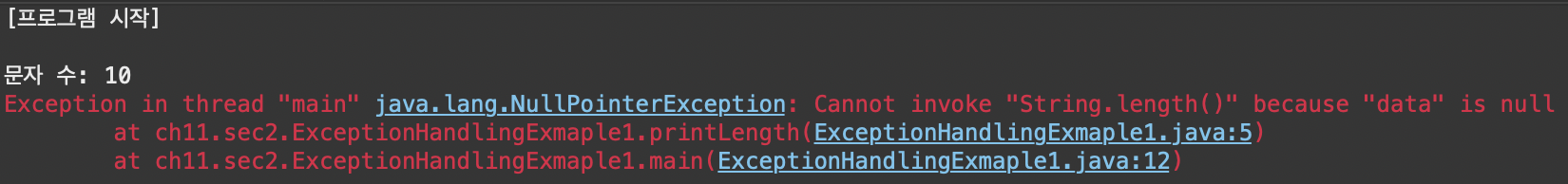 - main() 메소드에서 throws 키워드를 사용하는 경우, JVM이 최종적으로 예외 처리 수행 -> 예외의 내용을 콘솔에 출력