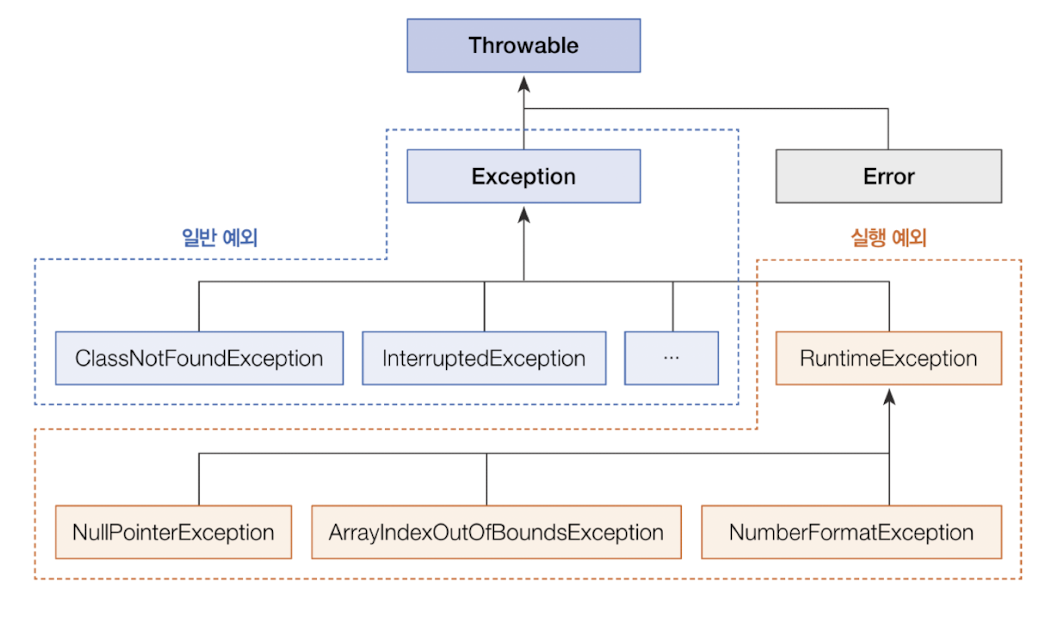 - 자바의 모든 에러와 예외 클래스는 Throwable을 상속받아 만들어지고, 추가적으로 예외 클래스는 java.lang.Exception 클래스를 상속받음
