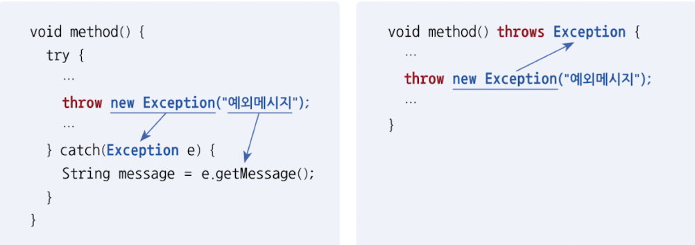 - 자바에서 제공하는 표준 예외 뿐만 아니라, 사용자 정의 예외를 직접 코드에서 발생시키려면 throw 키워드와 함께 예외 객체를 제공