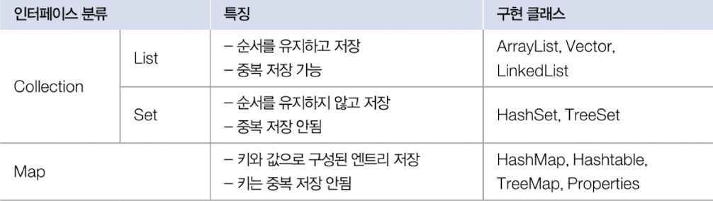 - java.util 패키지에 널리 알려진 자료구조를 바탕으로 객체들을 효율적으로 추가, 삭제, 검색할 수 있도록 관련된 인터페이스와 클래스를 포함 -> Collection Framework